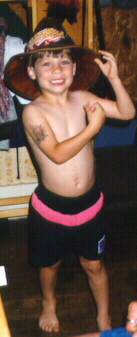 Zach once again, looking like a little redneck=P Barefoot, funky hat and fake tatto.